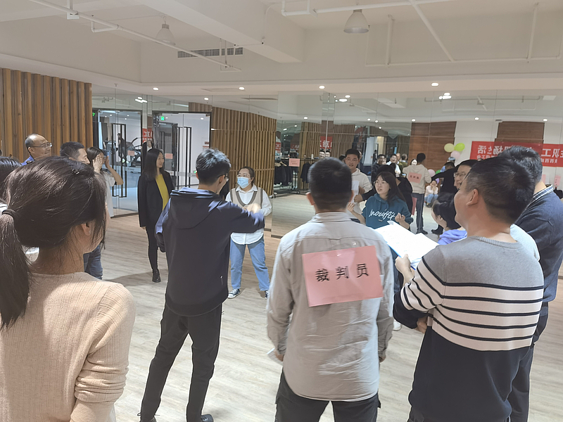 本次活動由女員工參賽,男員工擔任裁判員及后備隊員,活動分為個人賽和團體賽,各包含兩個項目。通過計時跳繩、踢毽子等個人項目,模仿競猜、穿針引線等團體項目,既鍛煉員工體力,又趣味十足,參賽者們個個不甘示弱,斗志昂揚,熱情高漲,現(xiàn)場氣氛熱烈,歡聲笑語此起彼伏,全體干部員工充分體驗到競賽的緊張、活動的趣味、團隊的溫暖。