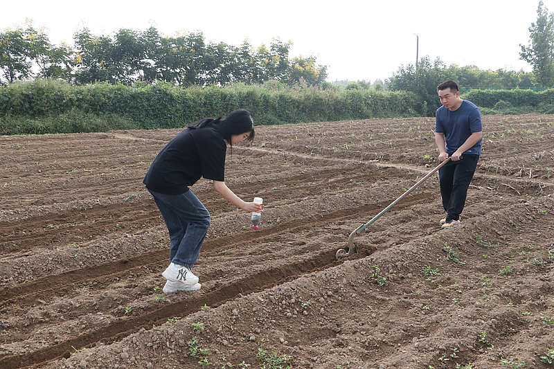 成熟的向日葵低下了沉甸甸的花盤,園區工作人員手持鐮刀向團員青年員工們示范了采摘向日葵的方法技巧,大家挽袖上陣,挑選著自己心儀的果實,持鐮砍收。隨后,在農業技術人員的帶領下,大家來到了蔬菜種植區播種油菜,男生們松土犁地,將基土整理成一道道規整的形態;女生們順壟而行,將一粒粒油菜籽均勻地播撒其中。農耕雖累,但勞有所獲,讓大家樂在其中、喜笑顏開。