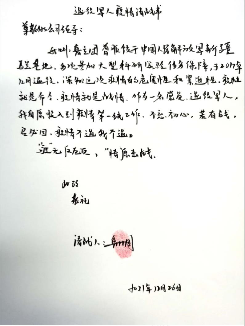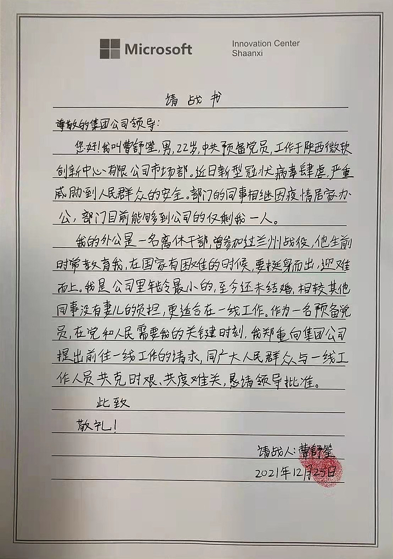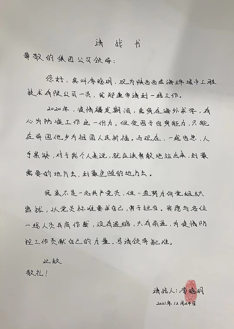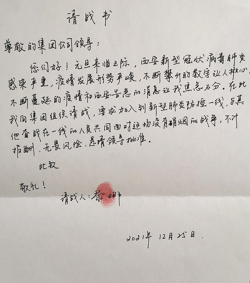 “我是土生土長的灃西人,對附近村子情況比較了解,我申請出戰抗疫一線!”“作為一名共青團員,深知此次防疫責任重大、人員緊缺,我堅決服從組織調配!”“來到公司剛好三個月,期間感受到了組織的溫暖,現在組織需要我,我申請出戰!”“我曾參與2020年疫情防控工作,對防疫工作比較熟悉,能夠更快進入工作狀態,請組織批準出戰!”........