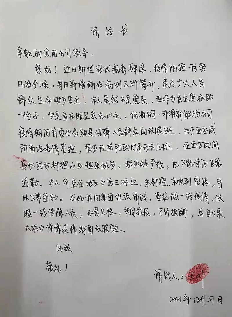 “本人居住小區未被封控,可以保證正常通勤,我向組織請戰,要求做一線防疫、供暖保障人員,無畏風險、不計報酬!”這是一名80后員工,她叫王川,是灃西集團下屬子公司能源公司的一名員工,在防疫工作開始后,她一貫沖在前干在前,值班時總是要求第一班。為了讓其他同事可以休息,可以輪休的情況下依然堅持每天到公司到崗上班,保證工作不斷檔。公司在防疫執勤點排班時主要安排男同志,但身為女同志,她多次申請前往一線。12月27日,在全市新一輪核酸檢測行動開始前,王川同志主動手寫請戰書,再次要求到一線防疫!目前在灃西新城馬王村開展防疫工作。