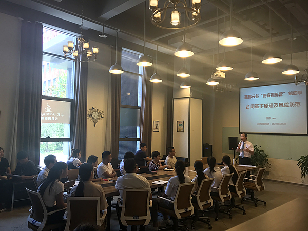 2018年8月9日,云谷創(chuàng)客訓練營第四季“合同風險防范”知識講座在西部云谷順利舉行。本期課程邀請陜西樂友律師事務所程偉律師為西部云谷園區(qū)企業(yè)進行講解,吸引了30余名創(chuàng)業(yè)者參與。