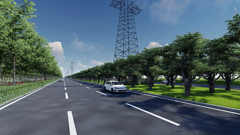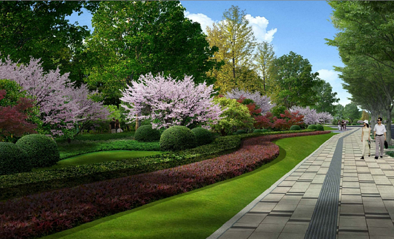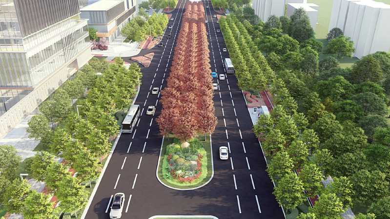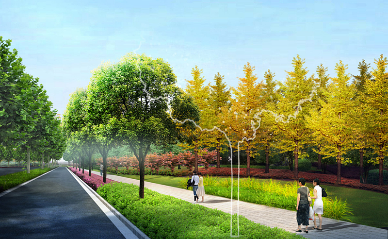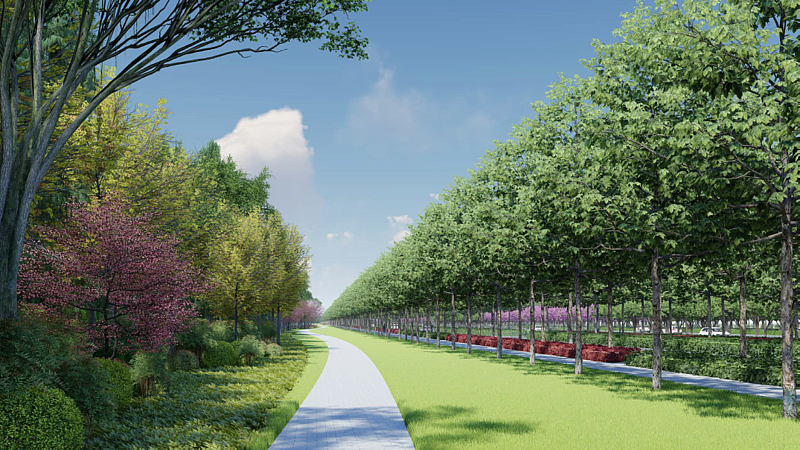 為城市主干路景觀配套,全長1.6公里,綠化面積約9萬平方米。該路段通過栽植高大喬木法桐、油松、國槐等鄉(xiāng)土樹種,端頭點綴組團植物群,致力于構建自然生態(tài)的植物景觀,營造休閑舒適的品質街景。計劃于2023年完成相關區(qū)域地形整理及綠化栽植施工。
