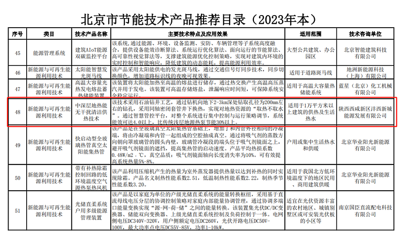 北京市節能技術產品推薦目錄是由相關專家對節能技術產品進行綜合評審所形成的,涵蓋建筑圍護結構、供熱鍋爐系統、空調通風系統、照明和采光系統、電力電氣技術、數據中心節能技術、能源管理系統、新能源與可再生能源利用等領域的53項節能技術產品目錄。能源公司的中深層地熱能無干擾清潔供熱技術,具有“取熱不取水”的特點,系統能效可達4.0以上,比傳統淺層地源熱泵節能30%以上,節能效益顯著。