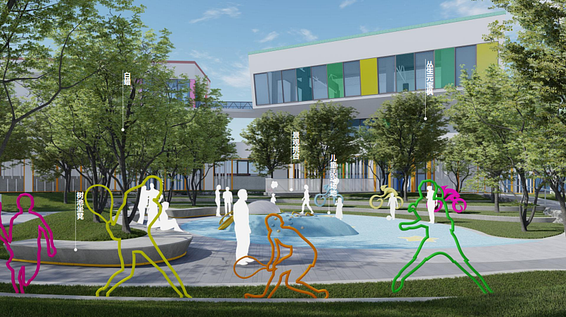 健康激情:在立面設計上,秦創原生態科創島體育村落采用清新明亮的色彩,整體配色采用暖色調,與墻面和諧統一,局部采用冷色作為點綴,整體設計大氣活潑。