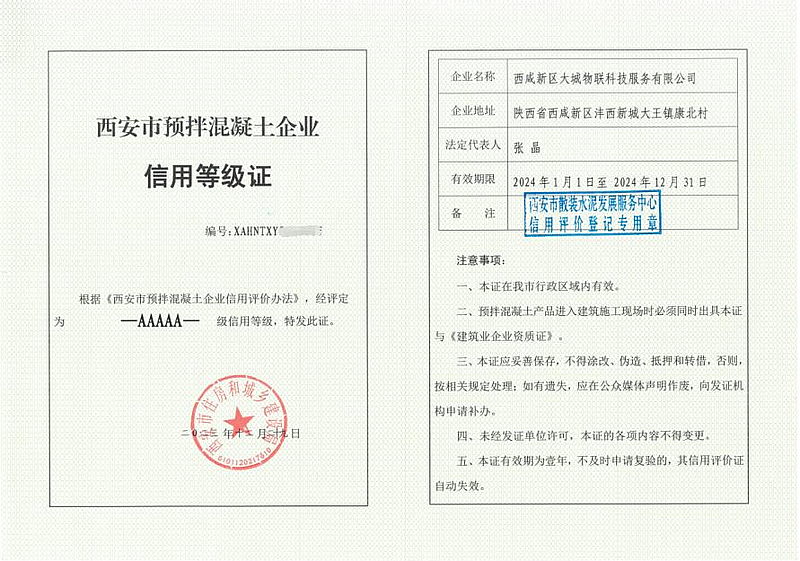 獲評西安市預拌混凝土企業“5A”信用等級