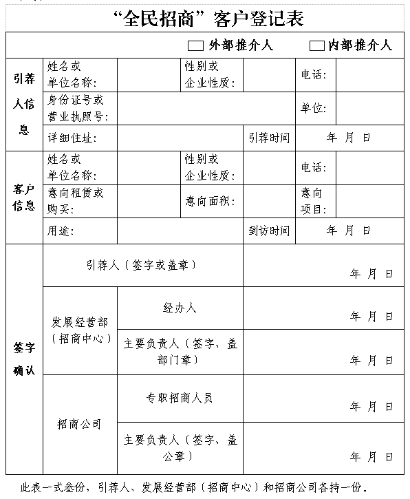 (三)客戶首次到訪,引薦人要與客戶同時到場,招商公司和專職招商人員需在《“全民招商”客戶登記表》簽字蓋章確認客戶為首訪。