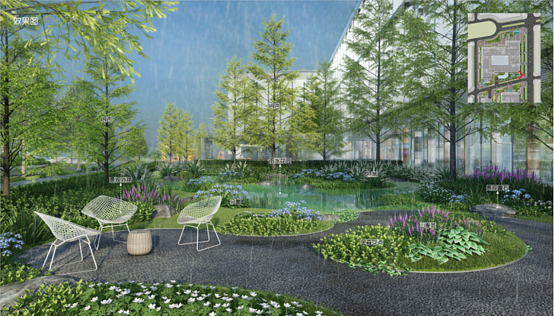 園區內以簡潔的復層種植為主,堅持生態性,注重特殊性,考慮季相性,打造四季怡人的生態環境。采用區域喬木陣列式種植,形成規則種植形式;局部運用開花地被,形成簡潔飄逸的商業景觀空間;部分區域栽植草花地被,點綴銀杏,增加季相變化效果,形成視覺焦點。