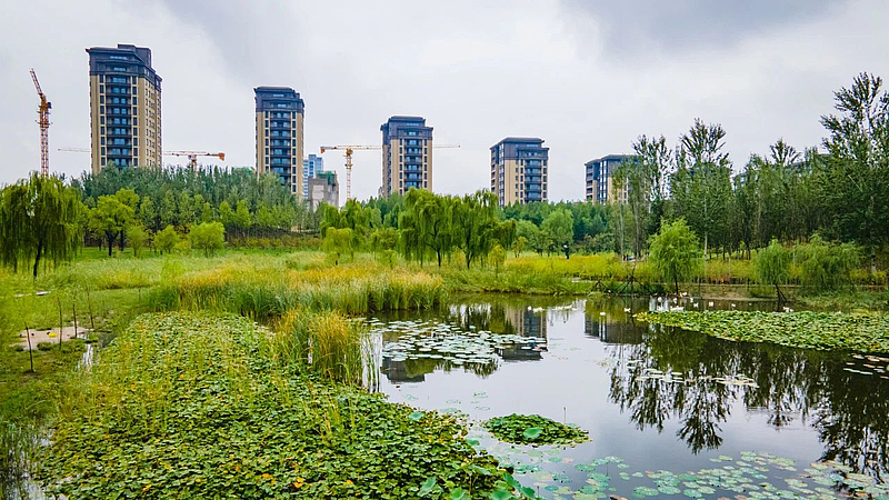 在海綿城市建設中,灃西新城創新提出了“建筑地塊確保雨水應收盡收、市政道路加強集水功能、景觀綠地優化豎向設計、中央雨洪系統形成調蓄樞紐、河道修復增加天然水域”等做法,對雨水進行“滲、滯、蓄、凈、用、排”多種方式處理。