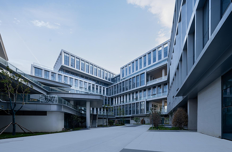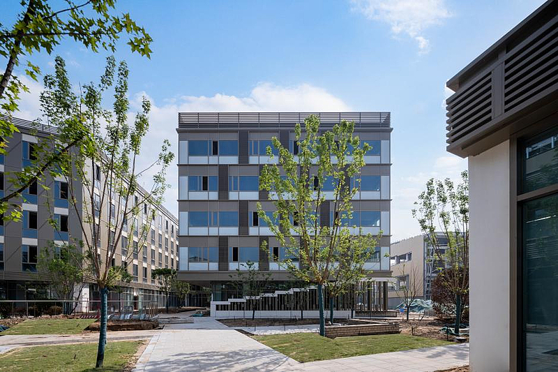 5單元位于秦創原生態科創島北側,占地面積130.6畝,總建筑面積22.44萬㎡(地上建面14.29萬㎡,地下建面8.15 萬㎡,車位數量1683個),是集科研辦公、創客中心、品質住宅及花園商業為一體的科技轉化研發基地,建筑采用圍合式布局形式,通過退臺及錯層的手法,豐富城市天際線變化的同時,提升區域整體的標識性,活化內外空間的聯系。