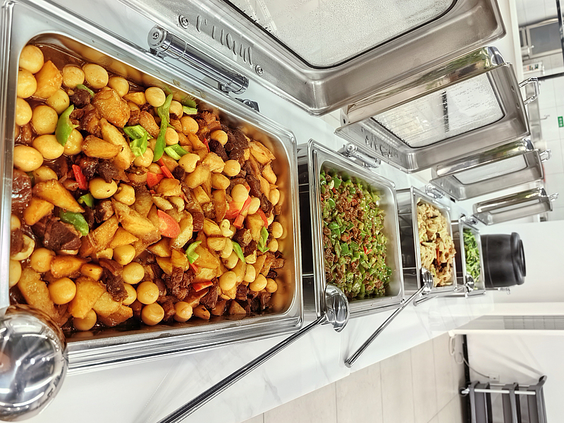 走進餐廳,映入眼簾的是明亮干凈的就餐環境,桌椅擺放整齊,用餐氛圍舒適,后廚整潔有序,專業廚師團隊從食材挑選到烹飪出品,每道工序都嚴格把控,讓大家吃得更安心。