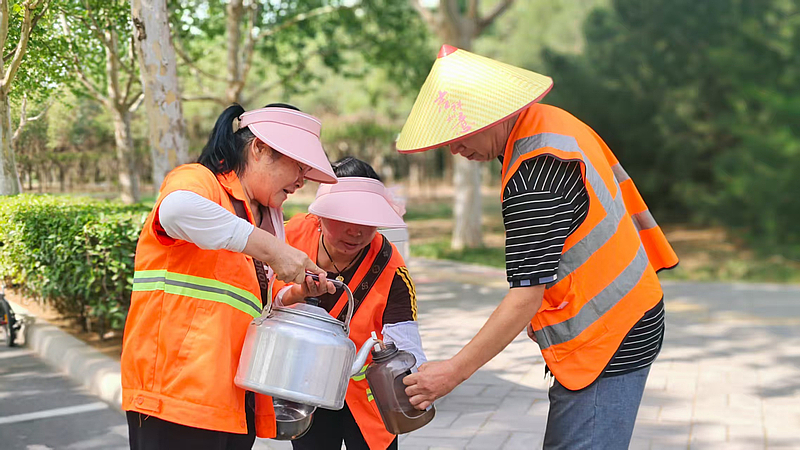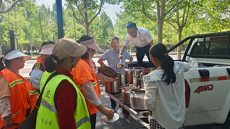 考慮到環(huán)衛(wèi)工人分布廣、作業(yè)點分散的特點,除固定補給點外,灃西集團服務(wù)公司還安排專人駕駛?cè)嗆嚧┧笥谛鲁歉鱾€保潔區(qū)域,將一碗碗綠豆湯送到正在作業(yè)的環(huán)衛(wèi)工人手中,確保每一位戶外勞作的“城市美容師”都能喝上一口清涼解暑的綠豆湯。