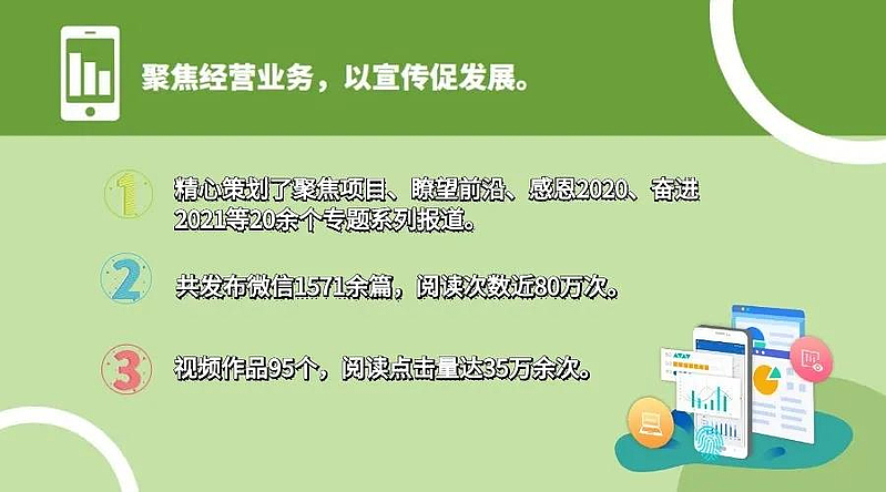聚焦經營業務,以宣傳促發展。統籌業績發展和精神文明建設,充分利用新媒體平臺,圍繞重點項目關鍵節點、經營業務重大進展、重大節假日等新聞宣傳點,相繼精心策劃了聚焦項目、瞭望前沿、感恩2020、奮進2021等20余個專題系列報道,共發布微信1571余篇,閱讀次數近80萬次;視頻作品95個,閱讀點擊量達35萬余次。