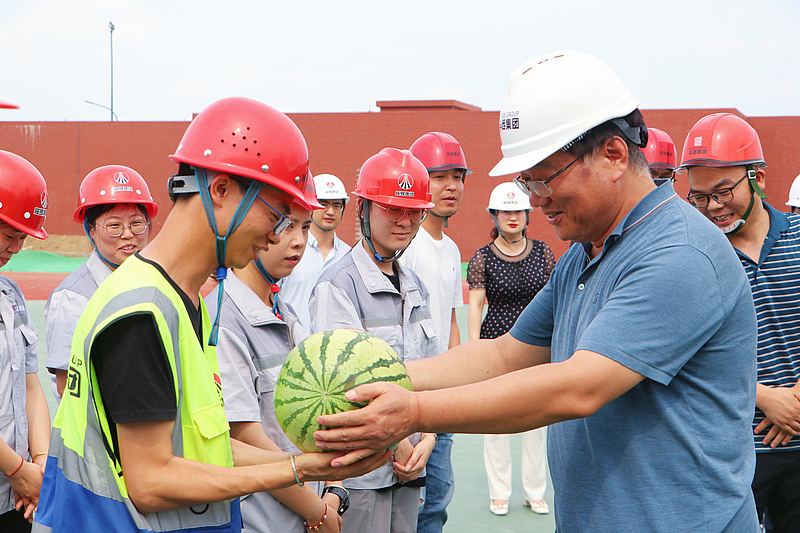 隨后,楊建柱一行將精心準(zhǔn)備的涼茶、西瓜、冰袖等防暑降溫物資送到堅守在開發(fā)建設(shè)和管理一線的勞動者們手中,對大家在高溫天的持續(xù)堅守和辛勤勞動表示感謝。