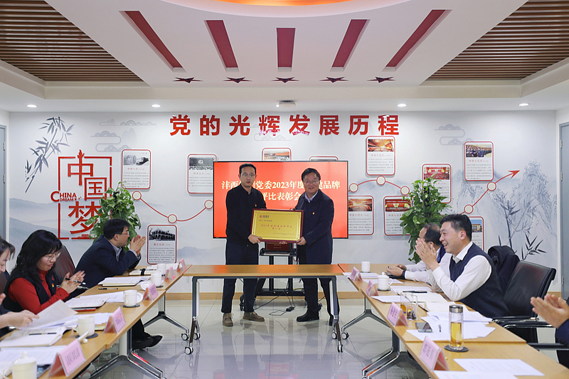 會上,郭廷喜宣讀了《關于表彰灃西集團2023年度黨建品牌評比獲獎單位的通報》,MIC黨支部、行政部黨支部、西咸信息產業園黨支部分別榮獲集團2023年度黨建品牌評比前三名。隨后,集團領導向獲獎單位頒發獎牌。
