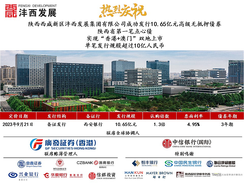 9月21日,陜西西咸新區(qū)灃西發(fā)展集團有限公司(以下簡稱“灃西發(fā)展”)成功定價發(fā)行10.65億元高級無抵押離岸人民幣債券,系陜西省首單點心債券,西部首筆“香港+澳門”雙掛牌點心債券,本次外債額度全額一次發(fā)行,將開啟灃西離岸融資新歷程!繼2023年5月成功發(fā)行15億元公司債券以來,灃西發(fā)展持續(xù)發(fā)力金融賽道,搶抓政策機遇,亮相國際市場,本次點心...