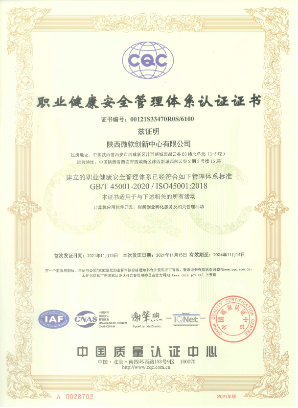 11月22日,陜西微軟創(chuàng)新中心有限公司(以下簡稱“陜西MIC”)順利取得中國質(zhì)量認證中心與國際互認聯(lián)盟頒發(fā)的QES管理體系認證證書(質(zhì)量管理體系<、環(huán)境管理體系和職業(yè)健康安全管理體系認證證書)。此次質(zhì)量管理體系、環(huán)境管理體系和職業(yè)健康安全管理體系認證證書的取得,標志著陜西MIC科學(xué)化、制度化、標準化管理得到進一步提升,為公司經(jīng)營生產(chǎn)...
