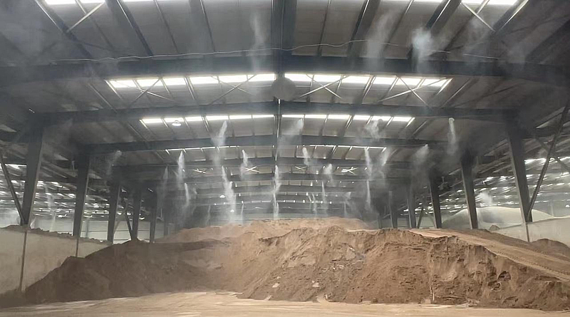 商砼站負責生產運輸的工作人員王澤坤介紹,這個料倉里,全封閉堆放著混凝土生產所需的所有砂石料。除了運料車“刷臉”進出外,此處始終處于全封閉狀態,7臺噴霧機2000多個噴頭,全天候自動循環工作降塵……