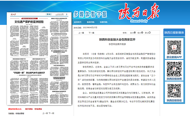 4月26日,陜西科創金融大會在西咸會議中心舉辦。本次活動由西咸新區和陜西金融資產管理股份有限公司(下稱“陜西金資”)主辦,陜西金資基金管理有限公司和西咸新區灃西新城基金管理有限公司承辦,邀請政府領導、金融專家、科學家、企業家、投資機構共同探討金融服務科創、助力秦創原發展之路,通過基金揭牌、項目簽約、金融產品發布等系列重磅舉措為秦創原科技創...