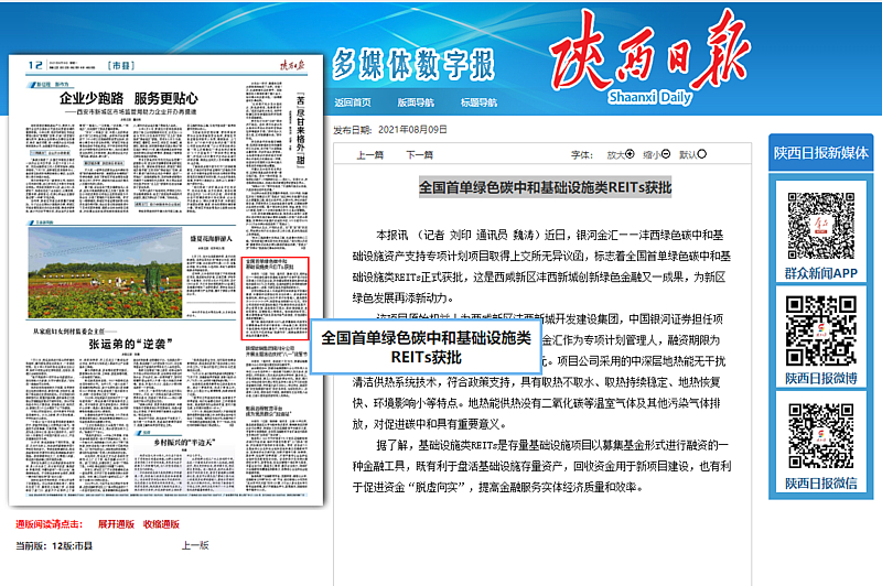 本報訊 近日,銀河金匯——灃西綠色碳中和基礎設施資產支持專項計劃項目取得上交所無異議函,標志著全國首單綠色碳中和基礎設施類REITs正式獲批,這是西咸新區灃西新城創新綠色金融又一成果,為新區綠色發展再添新動力。地熱能供熱沒有二氧化碳等溫室氣體及其他污染氣體排放,對促進碳中和具有重要意義。據了解,基礎設施類REITs是存量基礎設施項目以募集...