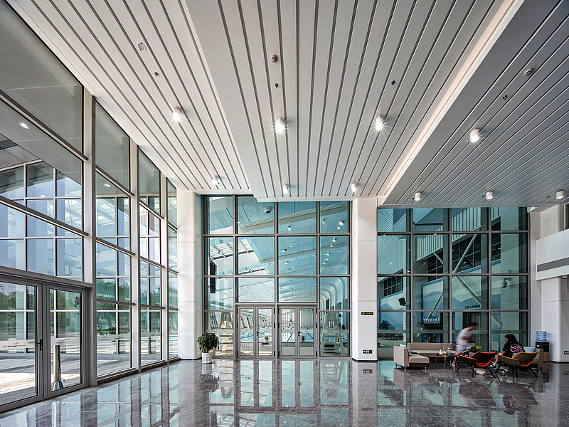 游泳館堅持“被動技術優先、主動技術優化”設計理念,巧妙利用建筑供暖系統、裝配式夾芯保溫復合板系統、主動遮陽系統等技術,確保游泳館恒溫舒適。此外,通過雨水回收、中水回收、泳池水回用等,提高水資源重復利用率,實現節能節水。