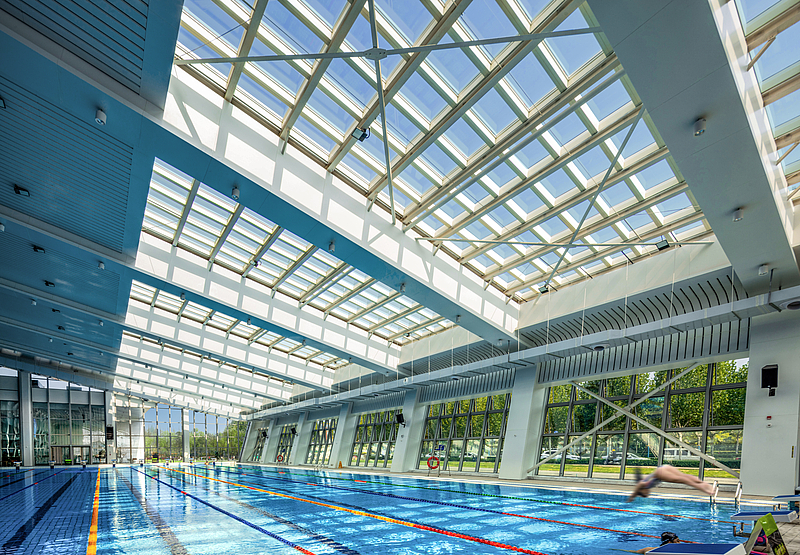 冬季,結合透光斜屋面采光體系,利用陽光房集熱效應儲能集熱,確保冬至日陽光覆蓋泳池八條泳道,最大限度存儲太陽能,大幅提升游泳館室內環境舒適度。春夏秋季,充分利用自然通風措施實現場館換氣、除濕、除熱,尤其是夏季自然通風換氣次數可達19次/小時以上,能夠100%消除室內余熱余濕及有毒氯氣,也可通過電動遮陽簾防止太陽直射過強。為確保天窗清潔,通過屋面天窗自清潔循環系統實現零水耗自清潔。