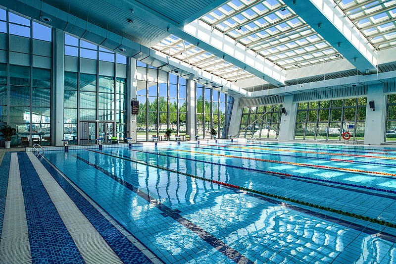 游泳館平面布局由泳池區和輔助區兩部分組成,3600平方米的通高泳池區,由50米標準長池(池深1.4米-1.8米)、25米標準短池(池深1.1米-1.3米)、兒童戲水池(池深0.6米)、熱水池(池深0.6米)組成,輔助區設局部二層,其中一層為泳池配套的淋浴、更衣等輔助空間,二層為2700平方米商業休閑健身中心。項目設1400平方米地下室,主要功能為設備層。