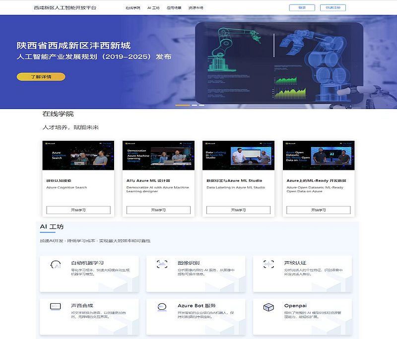 西咸新區(qū)人工智能開放平臺項目由集團公司二級子公司陜西微軟創(chuàng)新中心有限公司于2019年1月開始進行建設,2020年9月完成上線。平臺服務于我省高校、科研機構、開發(fā)型初創(chuàng)企業(yè)、政府、垂直領域各行業(yè),提供人工智能方向教學及認證考試、技術資源、訓練平臺和數(shù)字化轉(zhuǎn)型解決方案的綜合性平臺。項目主要包含人工智能開放平臺、人工智能學院、人工智能加速器3大版塊,涵蓋線上與線下建設內(nèi)容。